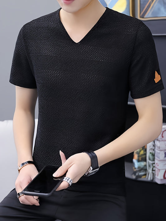Men'S V-Neck Short Sleeve T-Shirt - Lightweight Breathable, Casual Fit, Solid Black, Perfect for Summer, High-Quality Knit Fabric, Everyday Tshirt Casual Style Comfortable Fit