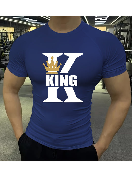 Men'S High-Elastic Breathable Short Sleeve Athletic Shirt - Summer Running Training Top with "KING" Crown Print, High Stretch Microfiber, White, Gym Wear Bold Design Subtle Sheen Finish, Gym Wear Shirts