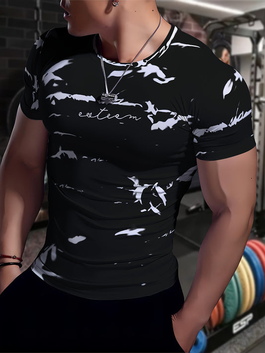 Men's High-Elasticity Anti-Tear Graffiti T-Shirt - Black White Geometric Print, Tight-Fit Athletic Top for Gym, Running, Yoga Casual Summer Wear, Gym Clothes, Highelastic Polyester, Short Sleeve Design