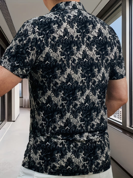 Men's Short Sleeve Shirt with Zipper Front - Black White Floral Print Summer Casual T-Shirt, Breathable Stand Collar, Regular Fit for Casual Attire, Easy Care Fabric