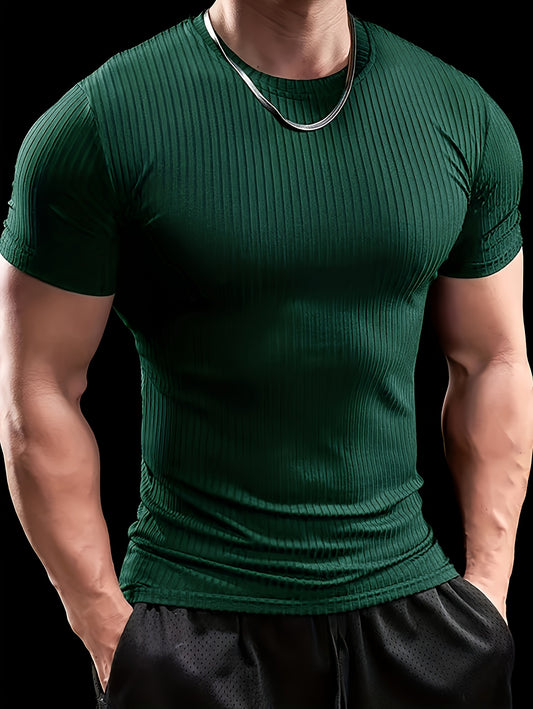 Men's Slim Fit Ribbed Short Sleeve T-Shirt - Stretchy Athletic Casual Wear, Green, Round Neck, Machine Washable, Muscle-Enhancing Design, Gym Shirts