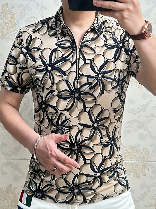 Men'S Lightweight Floral Print Short Sleeve T-Shirt - Stylish Black Beige Business Casual Top with Zipper Detail, Regular Fit for Summer, Summer Casual Wear Modern Casual Style Stylish Button Details