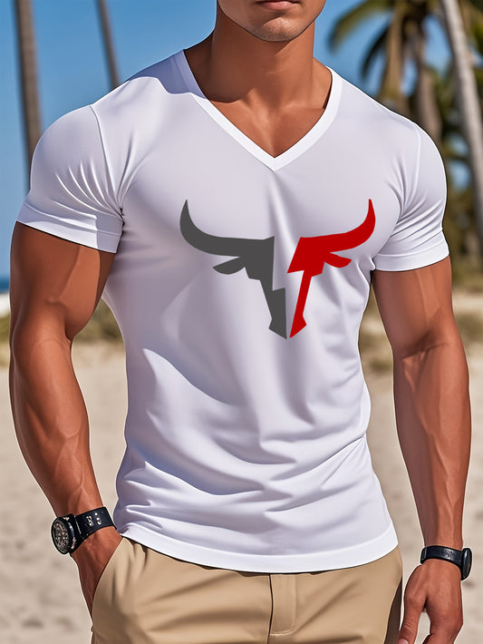 Men's Casual V-Neck T-Shirt with Bold Head Graphic Print - White Black Contrast Design, Breathable Regular Fit Short Sleeve Tee for Spring Summer Casual Wear, Quality Fabric Shirt