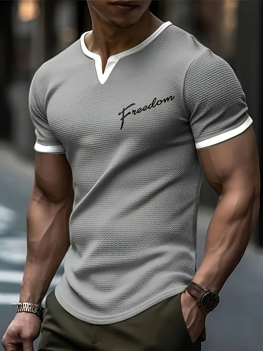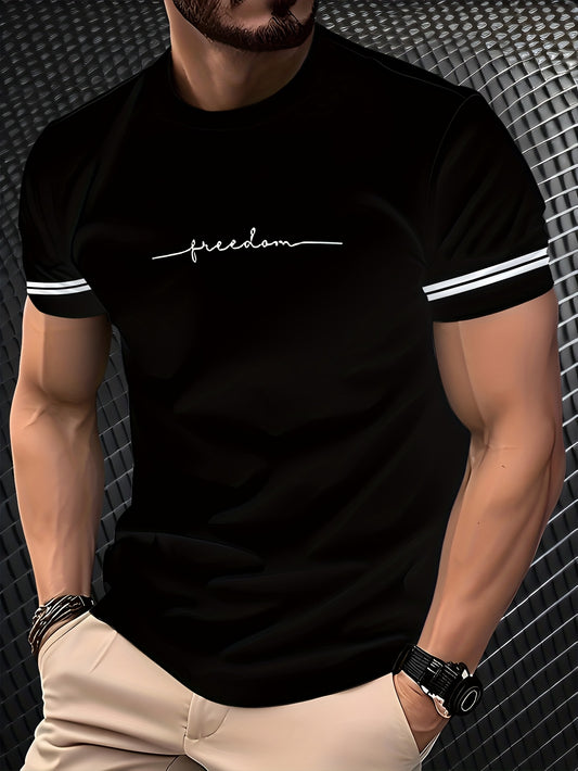 Men'S "Freedom" Graphic T-Shirt - Black Casual Crew Neck Tee with White Stripes, Breathable Polyester Blend, Regular Fit for Casual Attire, Everyday Tshirt Bold Print Tee Comfortable Fit, Knit