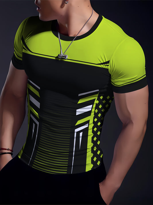 Striped Patchwork Design Pattern Print, Men'S Sports Fashion, Geometric Print High Elasticity Tight Fit Short Sleeved Round Neck T-Shirt, Summer Fitness, Training And Fitness Wear Quick Drying Sports Top with Coolness