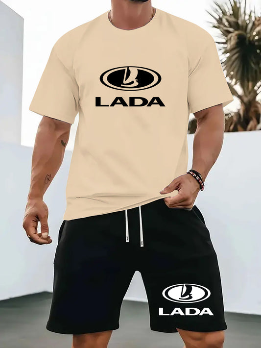 Men'S Summer Casual Sport Two-Piece Set - LADA Letter Pattern Print T-Shirt and Black Drawstring Shorts, Casual Sportswear, Regular Fit - Perfect for Summer Outdoor