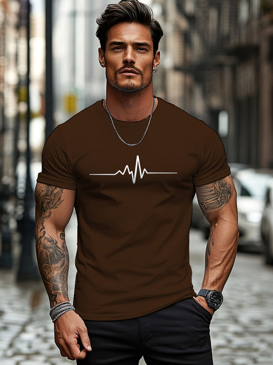 Men'S Brown T-Shirt with ECG Heartbeat Graphic - Casual Streetwear, Short Sleeve, Round Neck, Stretch Fabric, All-Season Comfort, Casual Streetwear Tee Round Neck Tshirt Comfortable Fit