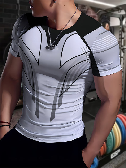 A Black And White Patterned Print Design, Men'S Sporty Fashion, Geometric Print High-Elastic Tight-Fitting Short-Sleeve Round-Neck T-Shirt, Quick-Drying Sports Top for Summer Fitness, Training, And Workout, with a Cool Feel,