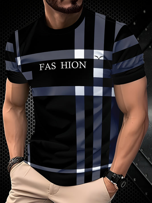 Men'S Casual "FAS HION" Graphic T-Shirt - Black Blue Plaid, Short Sleeve, Round Neck, All-Season Comfort Fit, Casual Attire Plaid Pattern Top Comfortable Fit Shirt