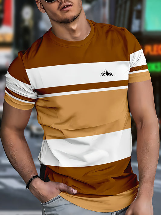 Men'S Casual Striped T-Shirt with Mountain Logo - Short Sleeve, Crew Neck, Lightweight Polyester, Summer Fashion, Casual Wear Striped Pattern Lightweight Fabric
