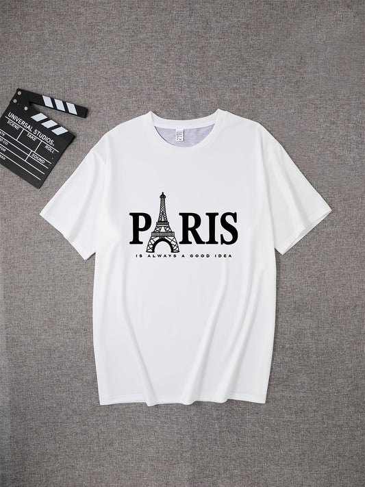 Men's Retro Paris Eiffel Tower Letter Print T-Shirt - Breathable Polyester Casual Short Sleeve Round Neck Tee, Machine Washable Summer Top for Casual Attire, Leisure Outfit, Comfortable Fit Shirt