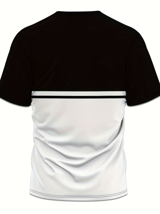 Men's Geometric Patchwork T-Shirt - Black White Contrast Design, Breathable 100% Polyester, Regular Fit Casual Summer Tee, Machine Washable