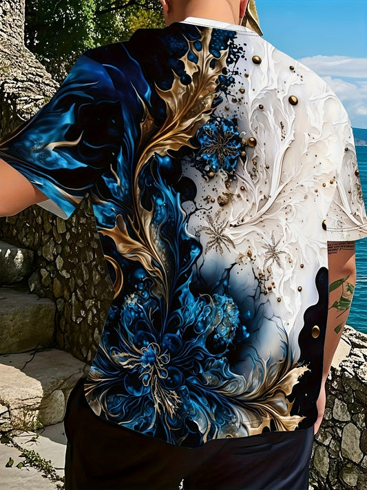 Men's Casual Short Sleeve T-Shirt with Dual-Sided Digital Print - White Blue/Golden Floral Design, Breathable Round Neck Tee, Machine Washable Regular Fit for Casual Attire, Streetwear Style, Bold Pattern, Lightweight Tee,