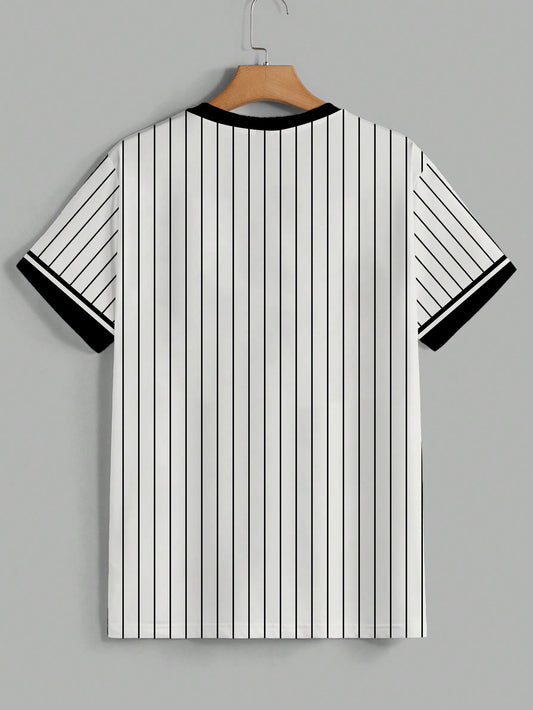 Men's casual short-sleeve round-neck striped polyester knit T-shirt, breathable, 110g/m², slightly stretchy, regular fit, smooth texture, suitable for summer weekend wear