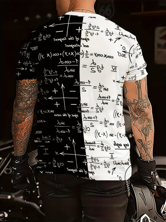 3D Fashionable Short Sleeve T-Shirt for Men - White with Black and Golden Mathematical Formulas Print, Crew Neck, Regular Fit, All-Season Comfort