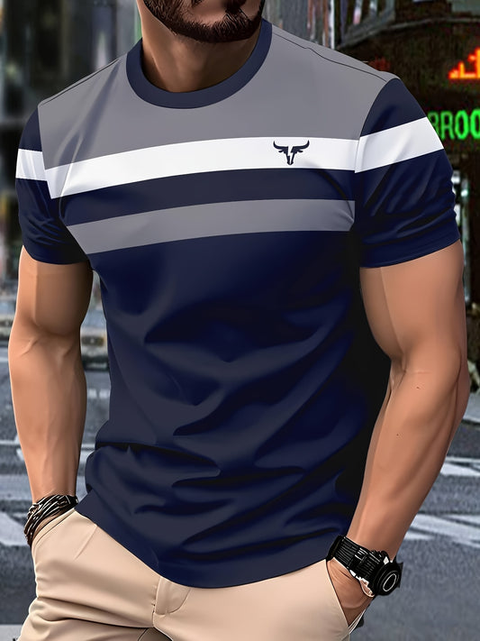 Men'S 3D Digital Print Short Sleeve T-Shirt - Vibrant Color Block Stripes Bull Head Logo, Breathable Lightweight Fabric, Regular Fit All-Season Casual Top, Durable Urban Style Tee, Versatile Clothing, Modern Fashion, Comfor
