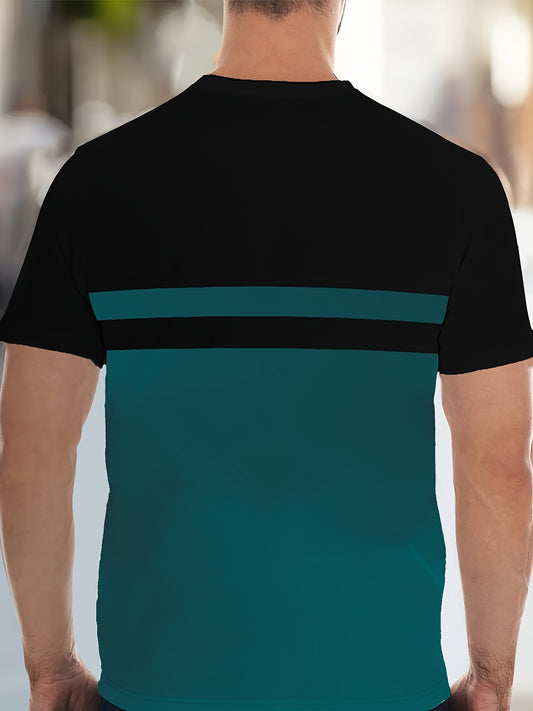 Men'S Novelty T-Shirt - Black Teal Color Block Design, Casual Crew Neck, Short Sleeve, Regular Fit, Polyester Fabric, Perfect for Casual Attire, Novelty T Shirt