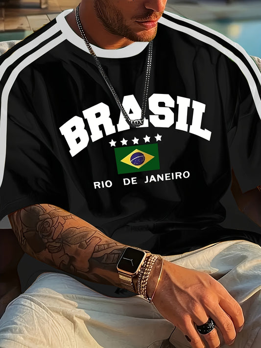 Men'S Casual Short-Sleeve T-Shirt with 3D Digital Printing, Round Neck, Brazilian Style, Made of Slightly Stretchy Polyester Knit Fabric, Suitable for Summer Outdoor Activities And Everyday Wear.