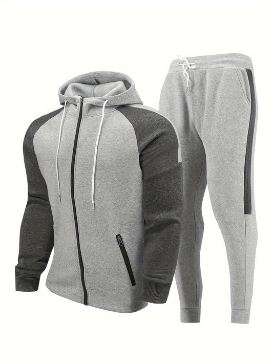 Men's Autumn Color-Blocked Zip-Up Hoodie with Side Pockets And Solid Color Drawstring Long Pants Set.