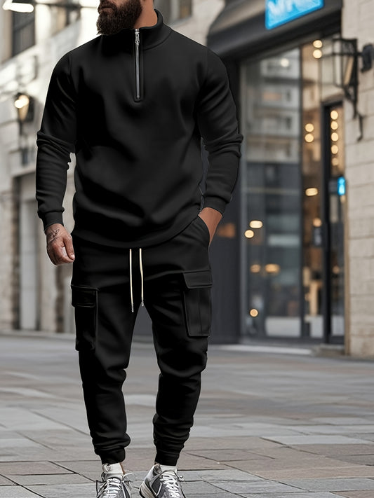 Versatile Ensemble, Men's Casual 2pcs Set: Heavyweight Zip-Up High Neck Sweatshirt & Pocketed Work Pants - Solid Color, Plush Fabric for Fall/Winter
