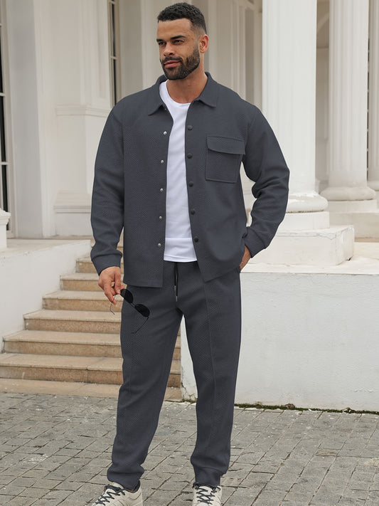 Men's Casual Sportswear Set - Long Sleeve Button-Up Shirt & Joggers, Stretch Fabric, Spring/Fall Collection