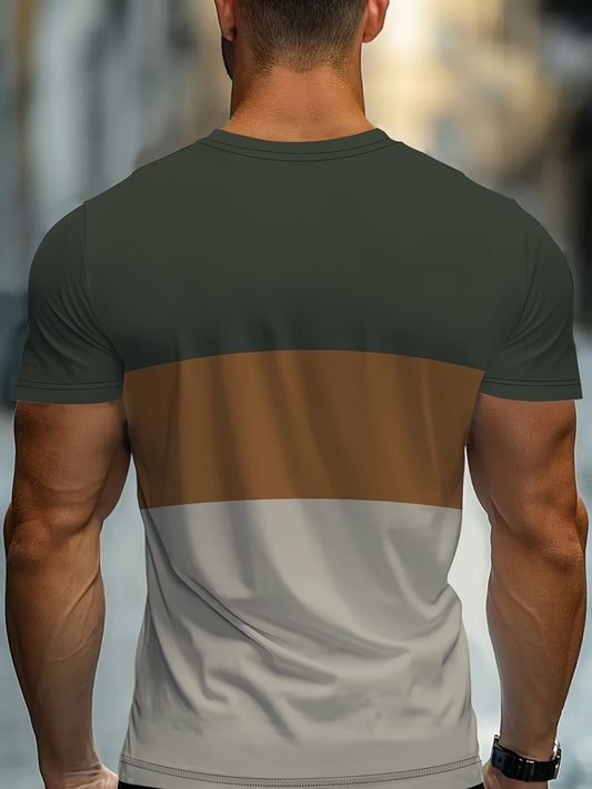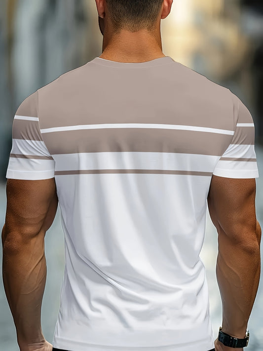 Men'S Casual Geometric-Print T-Shirt - Short Sleeve, Round Neck, Breathable Summer Tee with Color Block Design, White Brown, Perfect for Casual Attire, Breathable Clothing Color Block Design Comfortable Fit, T Shirt