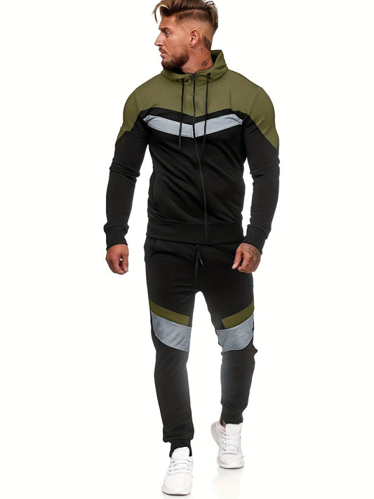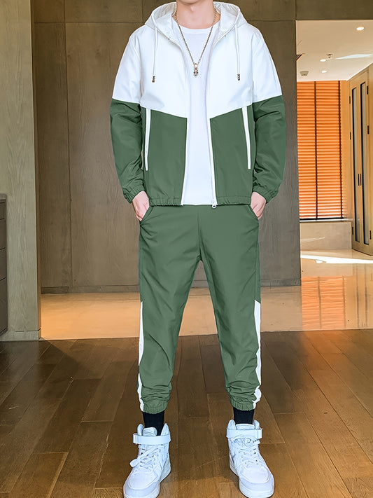 2pcs Men'S Casual Sportswear Set - Color Block Hooded Jacket and Pants, Polyester, Machine Washable, All-Season, with Pockets, Regular Fit, Spring Sportswear|Hooded Sportswear|Machine Washable Fabric