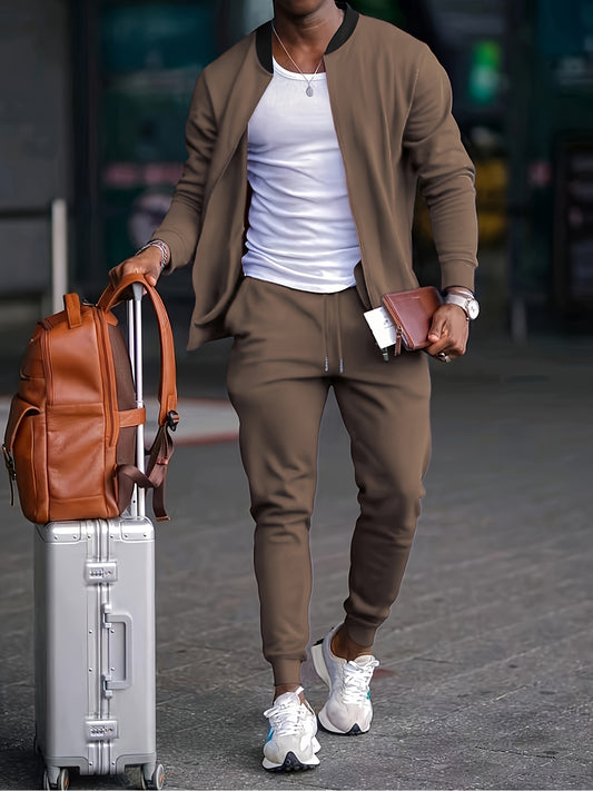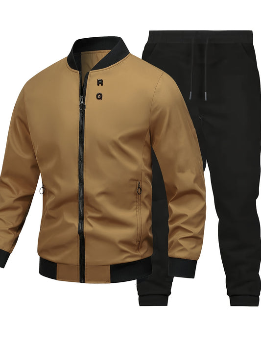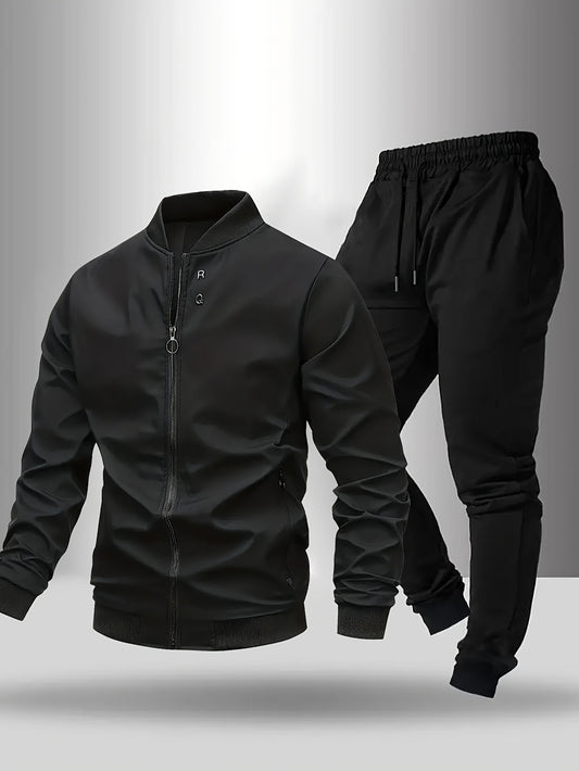 Men'S Casual Two-Piece Athletic Set - Black Baseball Collar Jacket with Zipper, Elastic Waistband Pants, Regular Fit for Spring/Fall, Spring Outerwear | Sporty Casualwear | Zippered Jacket