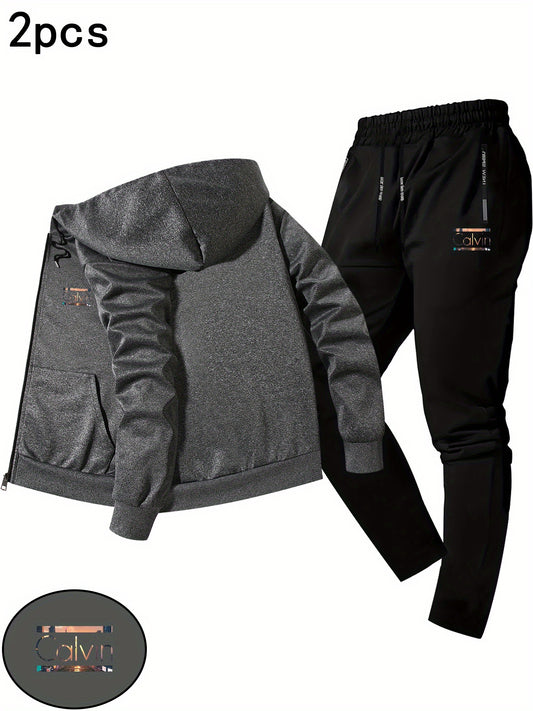 Men's Trendy Autumn-Winter Hooded Jacket Set with Calvin Print, Casual Youth Sportswear Outfit