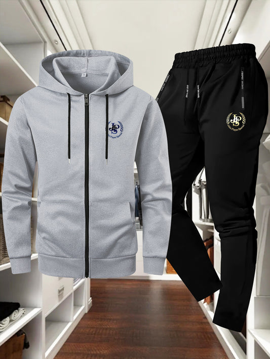 Men'S Trendy Autumn/Winter Jacket and Pants Set, JSP Print, Casual Young Sports Suit, Slim Fit, Long Sleeve, Zip-Up Hoodie with Pockets, Solid Color, Polyester, Casual Wear|JSP Print Jacket|Zippered Jacket, Autumn Clothin