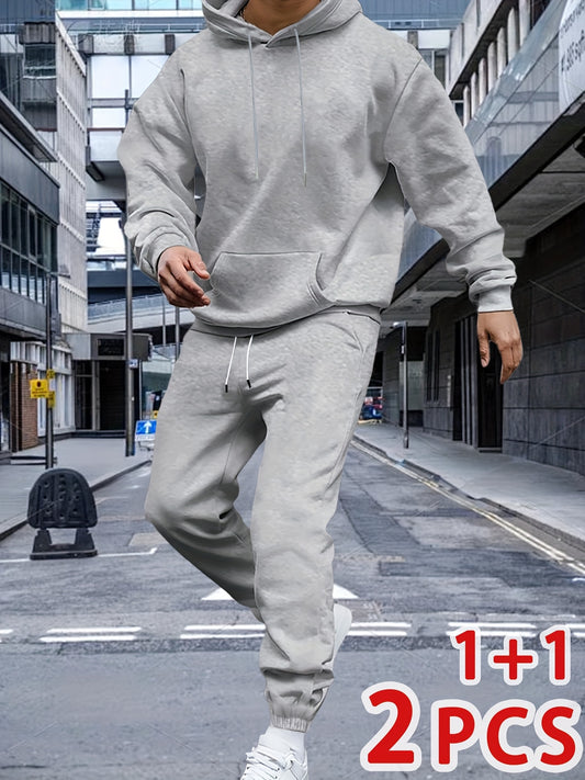 2pcs Men's Solid Color Hooded Long Sleeve Sweatshirt and Jogger Set, Suitable for Spring, Autumn, and Winter Sports Casual Outfit
