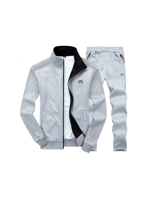 Men'S Casual Polyester Sweatsuit Set with Baseball Collar and Slight Stretch - Solid Color Long Sleeve Knit Fabric Track Suit for Fall/Winter