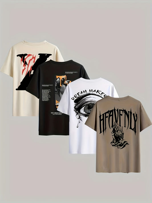 4pcs Men's Casual 3D Graphic T-Shirts - Bold Letter Abstract Print Short Sleeve Tees, Regular Fit Round Neck, Machine Washable, All-Season Comfort, 4 Color Options, T Shirts Graphic, Edgy Streetwear, Nontransparent Fabric