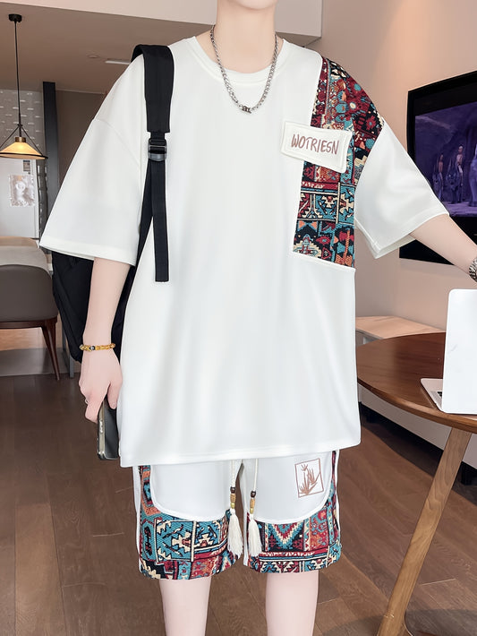 2pcs Men's Summer Casual Outdoor Set, Fashion Ethnic Style Round Neck Short Sleeve T-Shirt and Shorts Suit with Embroidery Design Loose Fit, Short Sleeve + Drawstring Shorts Combo, Suitable for Summer Outdoor Activities