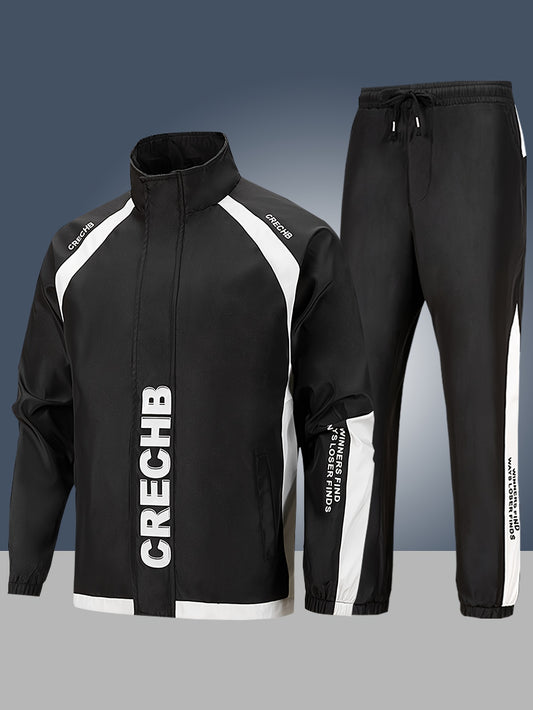 Men'S Spring/Fall Casual Sportswear Two-Piece Set - Black & White Contrast Color Block Jacket & Pants, Regular Fit Long Sleeve with Zippered Pockets for Hiking, Outdoor & Casual Wear, Hiking Clothes, Sporty Casual Attire, Con
