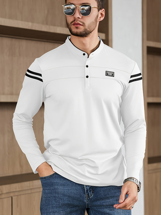 Men'S Casual Long Sleeve T-Shirt - Solid Color with Stand Collar Stripe Polo, Button-Up Front, Ideal for Outdoor Activities