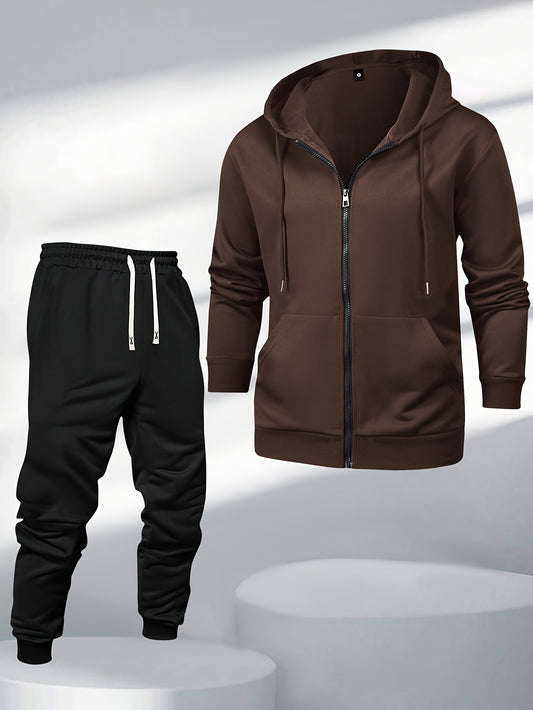 Men's Two-Piece Sportswear Suit: Zipper Hoodie + Sweatpants Set, Spring/Autumn Solid Color Regular Long Sleeve Zipper Hoodie with Drawstring, Threaded Trousers, Casual Sportswear Two-Piece Set