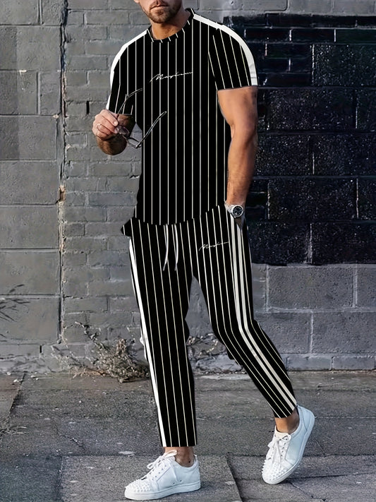 Summer Men's Striped Vertical Stripe 3D Print Casual Sports Short Sleeve Suit Fitness Sportswear Shorts T-shirt Men's Set Outdoor Sports Drawstring Pocket Hoodie Two-piece Set