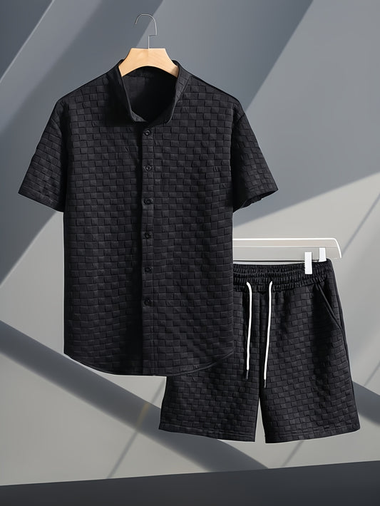 Men's Set Shirt Short Sleeve Shorts Thick Solid Color Knit Jacquard Casual Comfort High-Quality Two-Piece Set