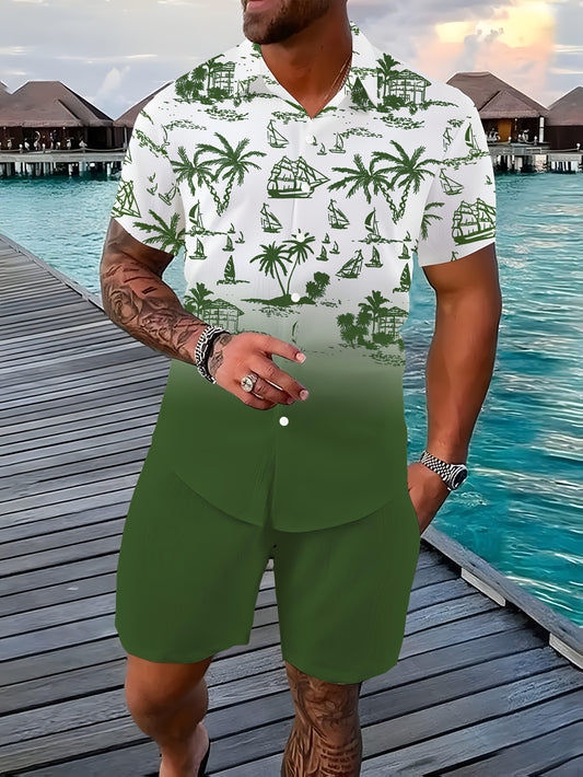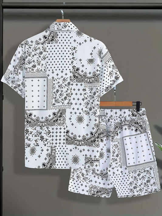 Men's Casual Suit Set with Short Sleeve Shirt and Printed Shorts