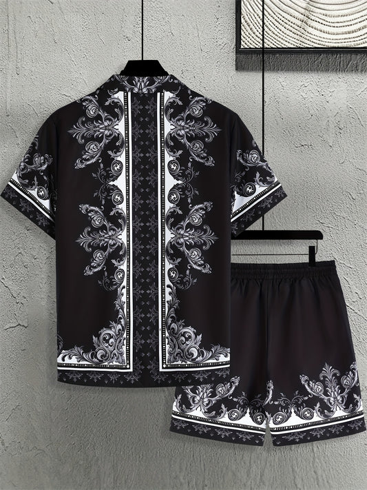 Men'S Suit with a Baroque Print Short-Sleeve Button-Up Shirt And Drawstring Side Pocket Shorts, Two-Piece Loungewear Set.