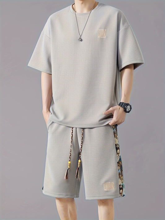 Men's Summer Casual Sportswear Set: Round Neck T-Shirt and Drawstring Pants, Fashionable Spliced Jacquard Breathable Quick-Dry Top and Bottom Outfit