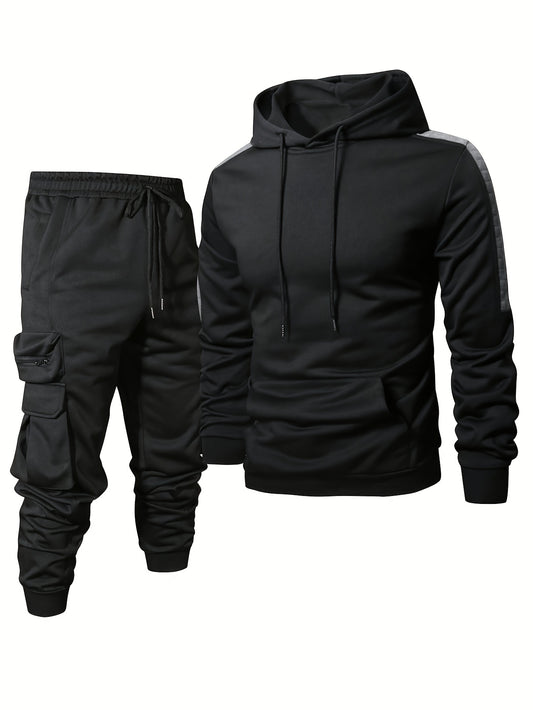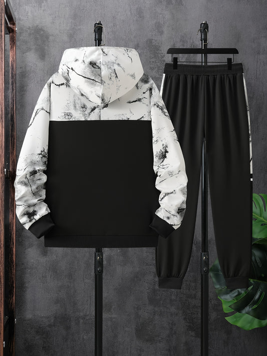 Durable Fabric, Men's Casual Sporty Hoodie and Jogger Set - Trendy Geometric Print, Blue and Black, Polyester Blend, Machine Washable, Perfect for Fall/Winter