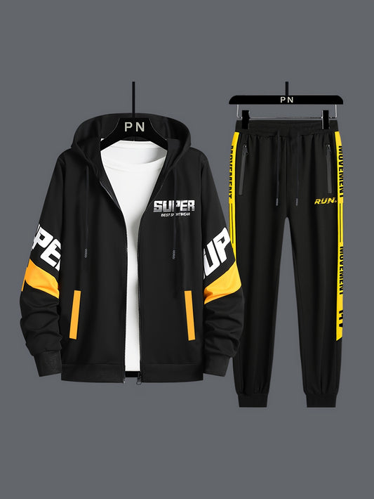 Men's AK Letter Print Long Sleeves Hoodies With Zipper Detail & Long Pants Two-piece Set, Slight Stretch Comfortable Clothing For Spring And Autumn