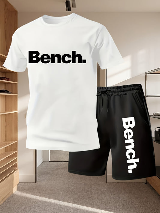 Summer Men'S Casual Sports Short Sleeve T-Shirt and Shorts Set, Comfortable Breathable, Suitable for Outdoor Jogging Running Fitness, Bench. Letter Print Design - 2pcs