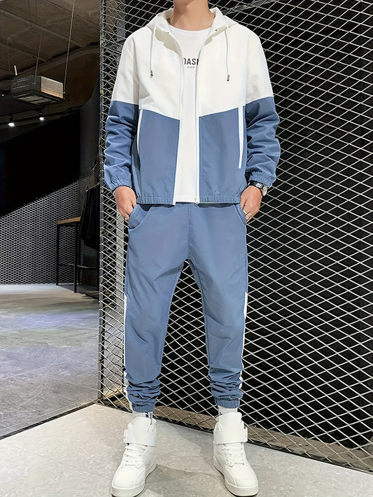 Men's Casual Athletic Hoodie and Pants Set - Color Block Design, Polyester, Machine Washable, Spring/Fall Sportswear, Blue & White Two-Piece Outfit, Everyday Activewear|Modern Athletic Look|Polyester Sportswear