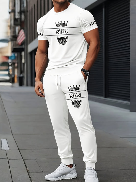 1 Set Men'S Plus Size 2pcs Summer Casual Outfit, Lion Print Short Sleeve T-Shirt and Sweatpants Set, Sports and Holiday Leisure Wear, Crew Neck, Knit Fabric with Slight Stretch, Polyester and Spandex Blend