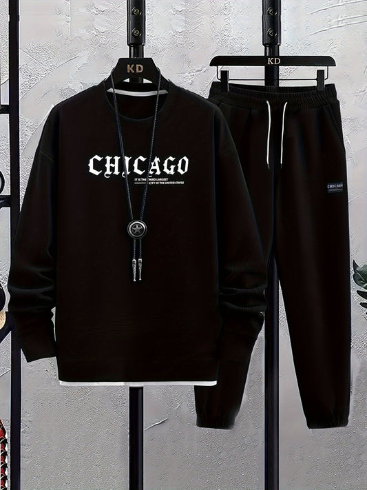 Men's Outfit, Chicago Graphic Print Casual Crew Neck Short Sleeve T-Shirt & Shorts 2-piece Set For Summer Outdoor Activities