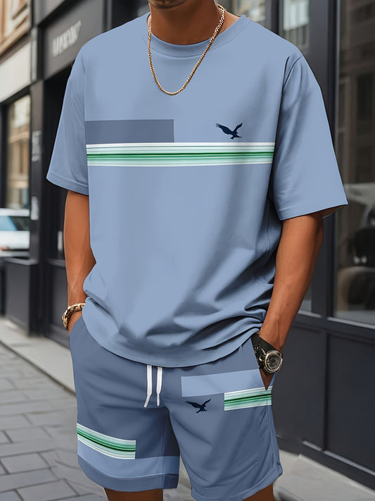 Men'S Casual Summer Two-Piece Athletic Wear Set - Light Blue T-Shirt with Green & White Stripes, Matching Shorts, Perfect for Daily Leisure, Vacation, and Sports, Casual Sportswear | Relaxed Fit Shorts | Stretchable Fabric