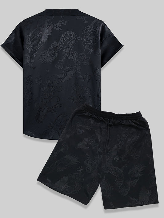 HZCX FASHION Men'S Vintage Summer Beachwear Set - Casual Button-Up Shirt & Drawstring Shorts with Traditional Dragon Design, Non-Stretch Fabric, Regular Fit, Perfect for Casual Attire, Summer Apparel | Casual Beachwear | Draw
